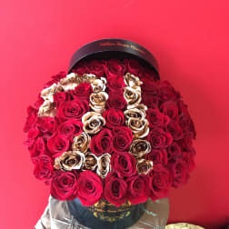 Price: $400.00RED ROSES WITH GOLD IN MIDDLE IN ROUND BLACK BOX